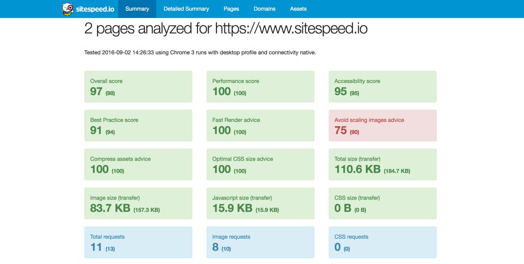 Sitespeed.io 从开发者的站点收集多个页面的数据,并根据最佳实践等规则来分析这些网页,然后将结果以 HTML 的形式输出,或者以数值的形式发送到 Graphite 。